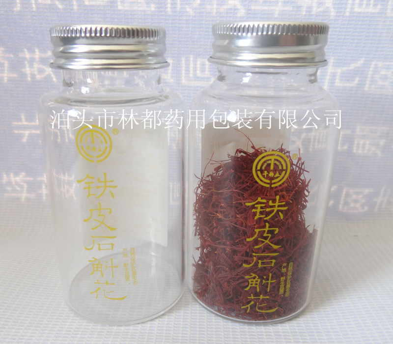 如圖所示, 瓶中所盛裝的產品為藏紅花, 藏紅花是屬名貴的中藥材, 藏紅花的顏色鮮艷,而漂亮,使用通透性較好的玻璃瓶,更展示了藏紅花的魅力。