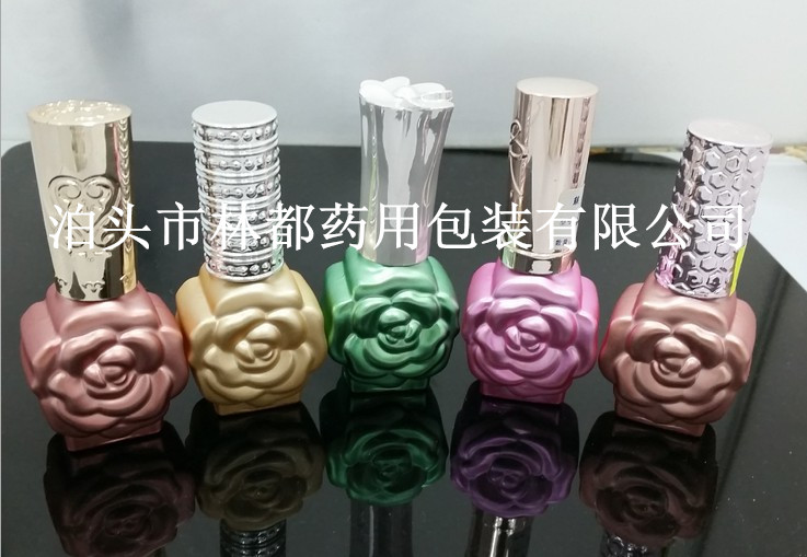 玻璃瓶噴涂電鍍加工后,不但可以用于盛裝產(chǎn)品的包裝,還可以做為工藝飾品收藏用, 如下圖的指甲油玻璃瓶,瓶體上出現(xiàn)了玫瑰花圖形,雖然玻璃瓶根據(jù)模具生產(chǎn)出造型的特色的瓶型,但是顏色需要后期的加工,才能出現(xiàn)如下圖玻璃瓶的效果,美觀,時尚。