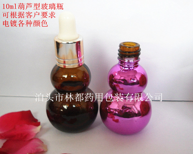 這款葫蘆型電鍍玻璃瓶容量為10ml ,可根據(jù)客戶要求電鍍各種顏色, 玻璃瓶電鍍后顏色艷麗,外表美觀,主要是用于盛裝各種高檔的精油等化妝品,配有各種形狀各異的蓋子,符合高端產(chǎn)品的形象,歡迎來電咨詢和訂購。