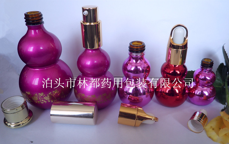 圖中我公司對我廠所生產的葫蘆型玻璃瓶左50ml,100ml進行了噴色,瓶身上并根據客戶印刷,增加視覺上的美觀性,這種電鍍噴色的玻璃瓶主要是用于盛裝高端的精油。