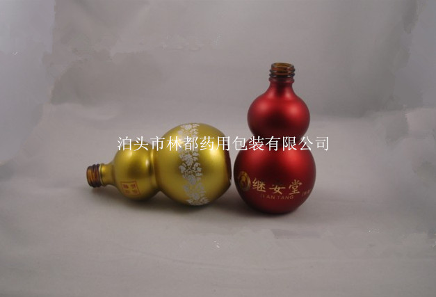 噴涂葫蘆型玻璃瓶可噴涂制作成各種顏色的,如圖所示,瓶身上還可進行印刷 。噴涂實際上是一種表面處理加工,使玻璃瓶顏色艷麗,更美觀。可用于盛裝各種高檔精油,也有客戶用于盛裝小顆粒狀丸劑藥品或保健品。
