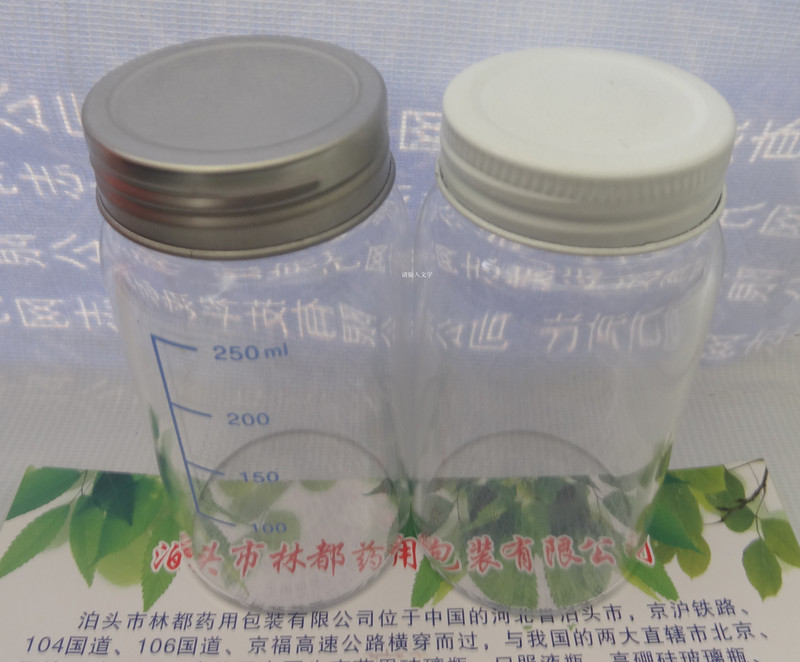 250ml高硼硅玻璃瓶直徑為64mm,高度為126mm,瓶口外徑為53mm。如圖所示這款玻璃瓶通透性良好, 通過玻璃瓶表面看字體,不變型,這就是高硼硅玻璃材質帶來的質量效果。