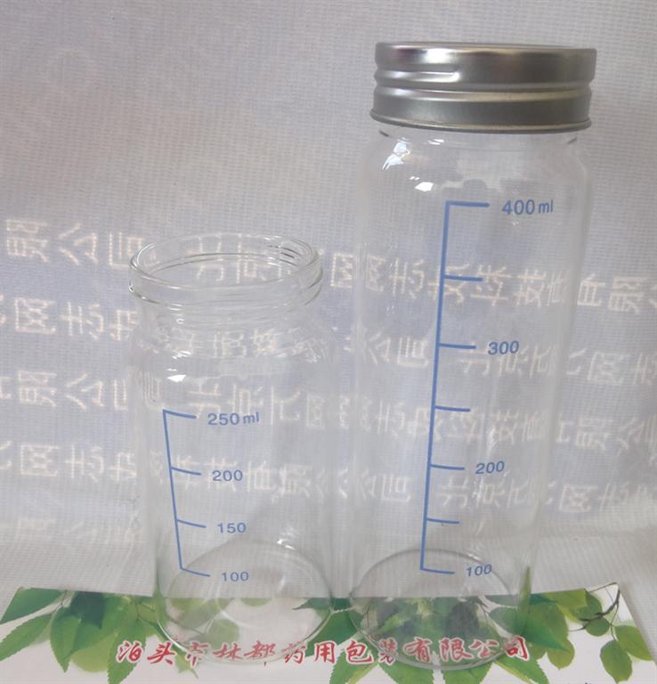 如圖中所示,這是一款容量為400ml, 以高硼硅玻璃管為原料的玻璃瓶, 瓶口為螺旋口,配有金屬蓋子和硅膠墊片,所配套的蓋子和墊片,都可以高溫滅菌,保證產品的安全潔凈。